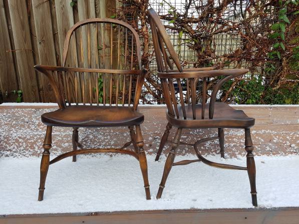 Uit eikenhout, ambachtelijk vervaardige Engelse Windsor chairs uit het begin van de 20e eeuw. Stoelen zijn erg stevig en hebben bovendien een comfortabele zit. Kortom, deze prachtig doorleefde, authentieke stoelen met dubbele boogrug zijn weer helemaal terug van weggeweest. Afm. stoel bxd is 60 x 55 cm., zitvlak bxd is 47 x 46 cm Zithoogte 45 cm, totale hoogte 100 cm. Prijs is per stuk.