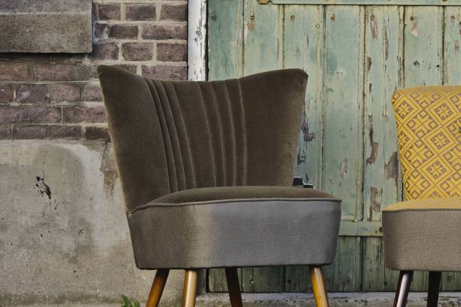 Mooie vintage cocktailfauteuil/clubfauteuil; binnenwerk is geheel vervangen en de stoel is voorzien van een combinatie van twee op elkaar afgestemde soorten meubelstof, ton-sur-ton, hetgeen een mooie uitstraling meegeeft aan deze comfortabele stoel met een perfecte zit, bestaande uit een pakket van veren. Periode: jaren '50. Afmetingen: hxbxd = 43 x 50 x 40 cm, totale hoogte 76 cm.