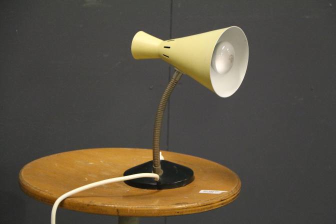 Vintage tafel- of bureaulamp van H. Busquet voor Hala Zeist uit de vijftiger jaren. Lamp heeft een zwarte voet met schakelaar, een zacht geel metalen kap en een buigzame chromen poot. Hij is verstelbaar, en dus in elke gewenste positie te zetten. Dit stijlvolle lampje is max. 27 cm hoog en heeft een diameter van 10,5 cm.